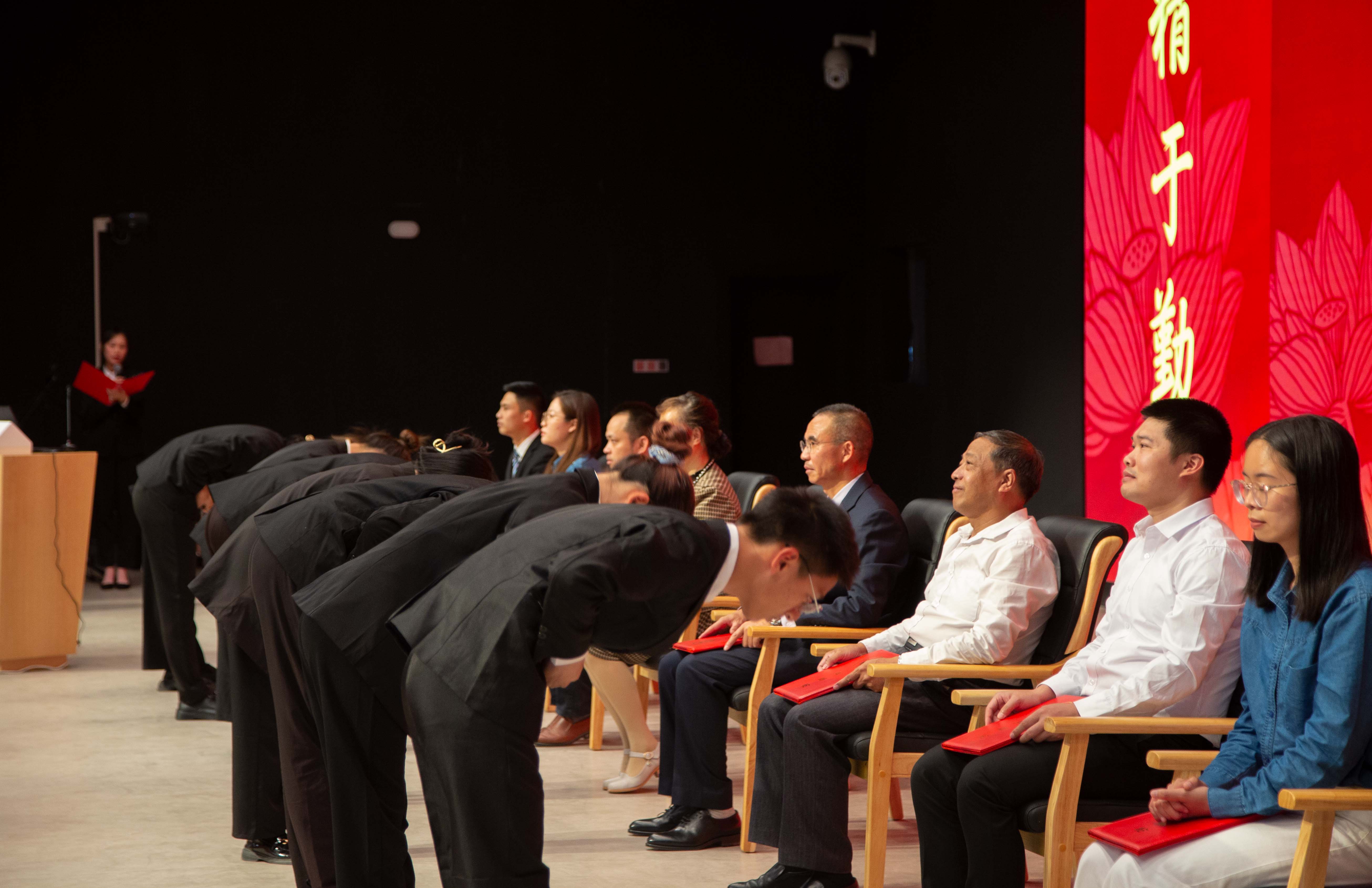 开学典礼还组织了特别的拜师仪式。伴随动听的音乐🫃🏼,学生代表向教师们“行拜师礼”“呈拜师茶”,表达对老师知遇携领、传道授业👌🕷、纠偏导正的感激之情🧙🏼‍♂️。随后,学生代表带领全体学生齐诵拜师帖,呈拜师帖,教师向学生赠送《三度修炼》。