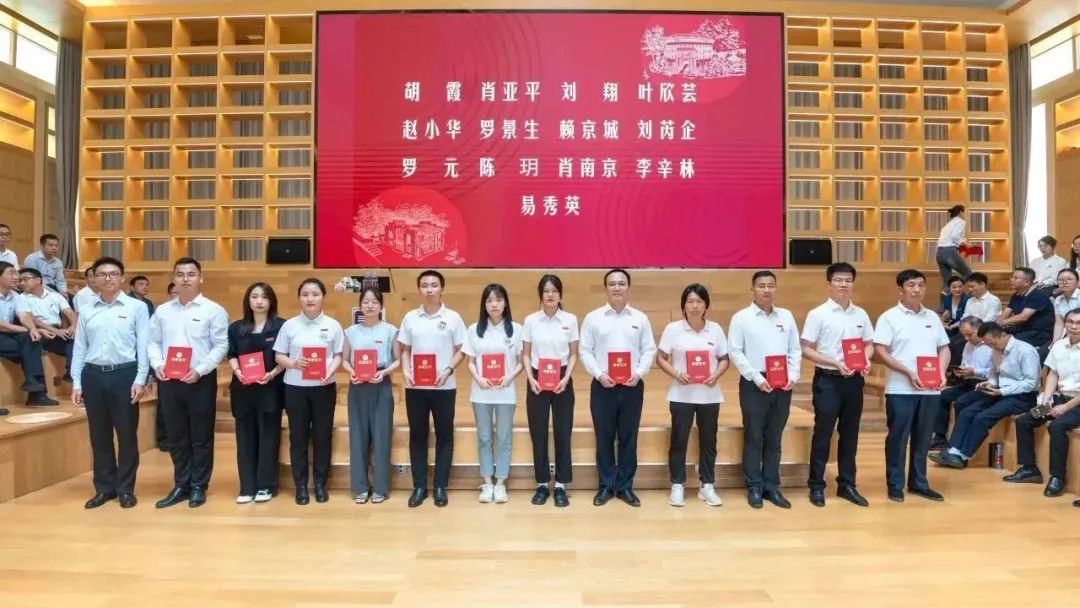 从左至右依次为:颁奖人——党委副书记、执行校长李兴🍷,刘翔⛔、陈玥赵小华叶欣芸🤸🏿、罗元胡霞🧑🏽‍🏫、肖亚平罗景生易秀英👨🏻‍🍼、李辛林、赖京城、肖南京🔫。(刘芮企因事未到)