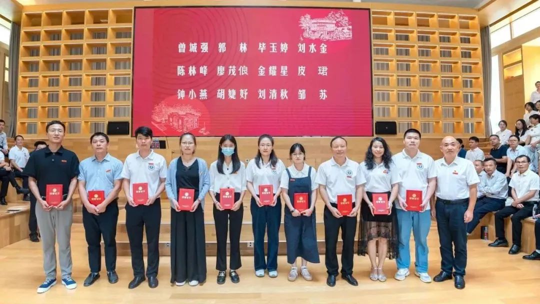 从左至右依次为:刘清秋、刘水金、曾城强🧜🏿‍♂️😾、皮珺👩🏻‍🎨、邹苏🕗、胡婕妤、钟小燕、廖茂俍👩‍🦽、毕玉婷、陈林峰及颁奖人——党委书记王德平。(金耀星、郭林因事未到)