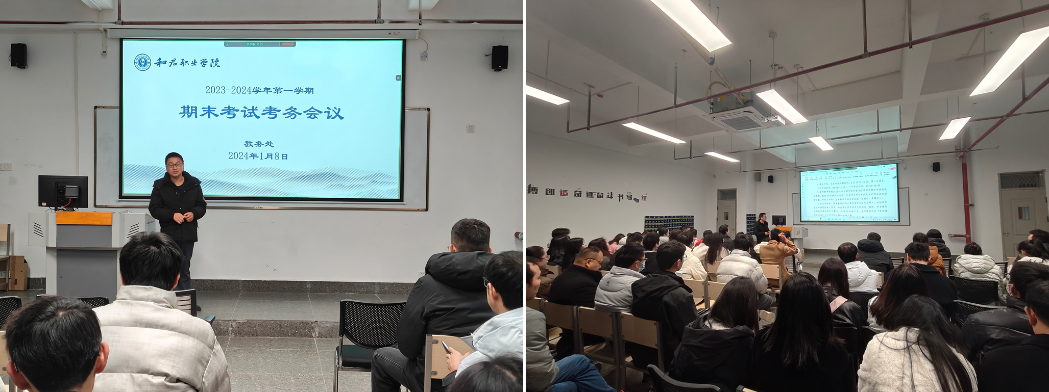 为了进一步加强对2023-2024学年第一学期期末考试的工作组织,扎实抓好各项开始工作𓀊,严肃考风考纪🧜♂️,营造公平、公正🦸♂️、和谐的考试环境🫸🏻。1月8日,教务处在西教学楼202召开期末考试考务会🕐,全体教师和行政人员参加会议。本次会议以 “线上+线下”形式举行,会议由教务处副处长郑勇军主持。