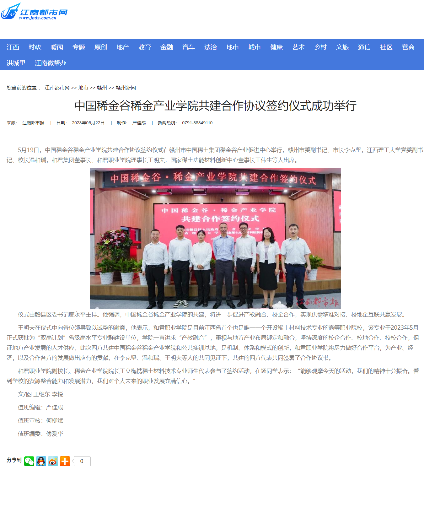 【江南都市网】中国稀金谷稀金产业学院共建合作协议签约仪式成功举行