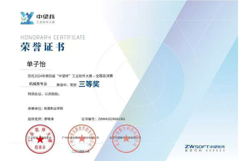 在刚刚结束的2024年第四届“中望杯”工业软件大赛全国总决赛中👨👦,我校稀金产业学院的学子展现了非凡的实力,来自智能制造2301班的单子怡同学在机械赛道的激烈角逐中脱颖而出,荣获全国总决赛三等奖。