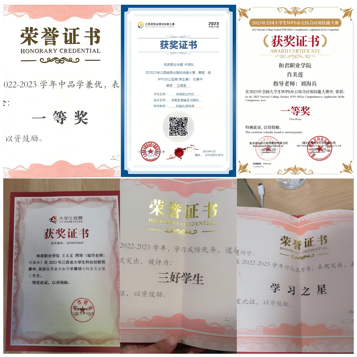 在校期间先后获得江西省大学生科技创新竞赛三等奖、江西省职业院校技能大赛三等奖👱🏼♂️、全国大学生WPS办公综合应用技能大赛一等奖♿、校优秀学生一等奖学金、“三好学生”“学习之星”等荣誉。