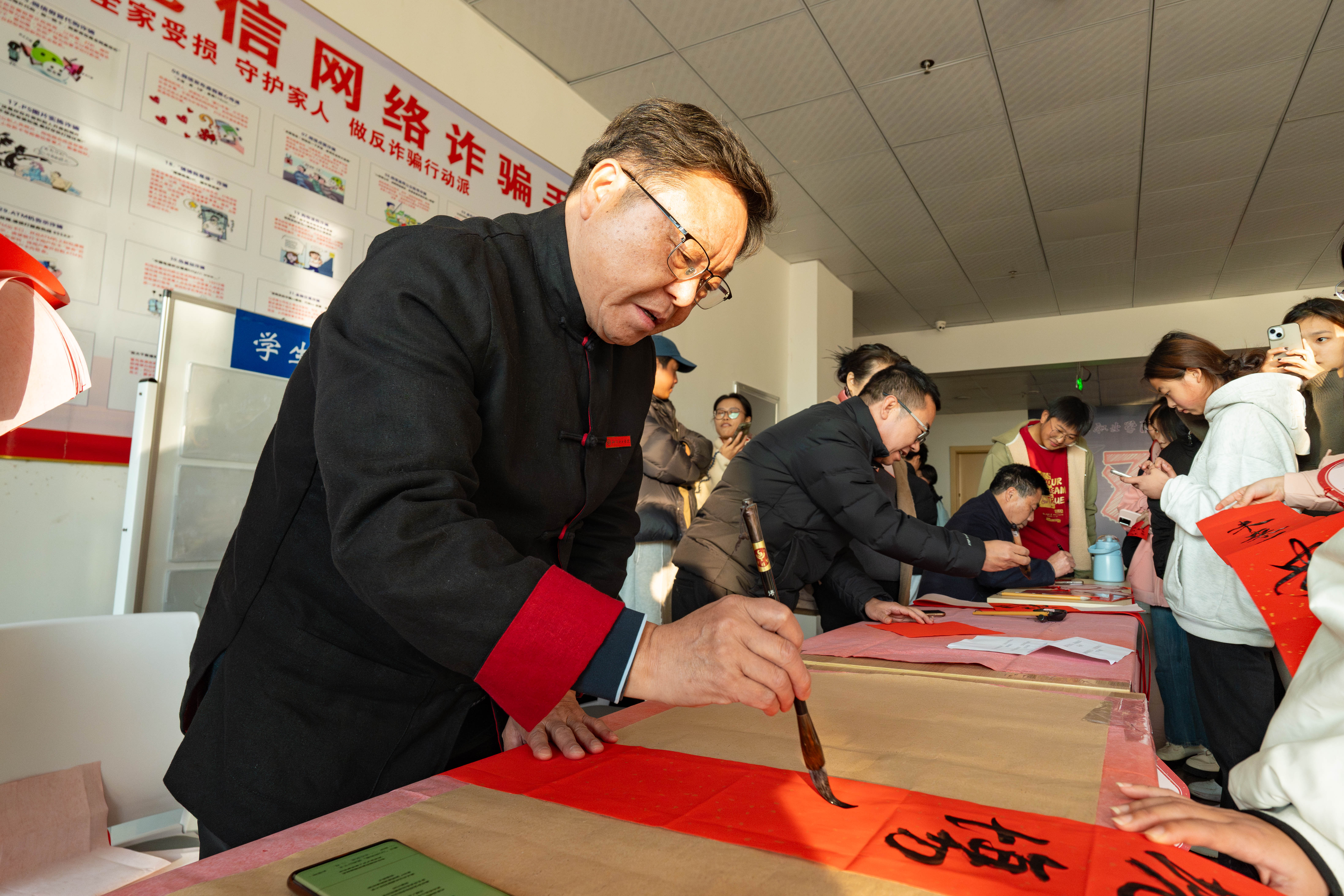 活动现场👨🏿💼,红纸铺展,墨香扑鼻。丁立梅🚴🏼、郭厚文、赵延兵、刘宁生等学校领导、老师及书法爱好者们挥毫泼墨,将浓浓的祝福倾注于笔端。“灵蛇献瑞福星照,喜气盈门岁月新”,“稀世珍宝现场促校企共赢,金玉良言杏壇培德技双修”……一副副寓意吉祥🙀🧑🏻🎓、满载祝福的春联在他们的笔下一气呵成🖊,展现出中华优秀传统文化的独特魅力。