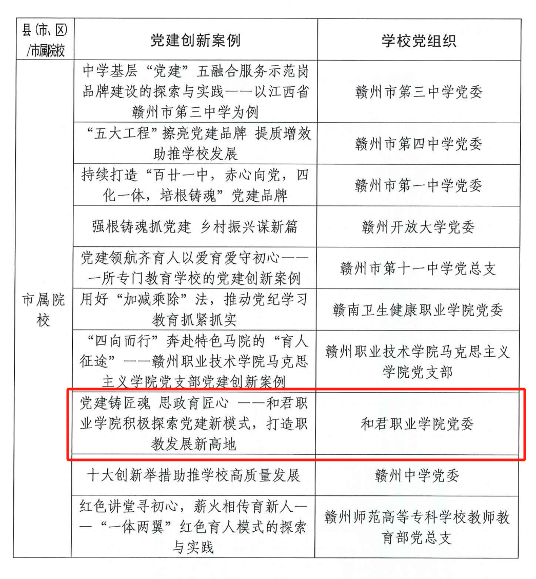 1月16日👃🏿,中共赣州市委教育工作委员会公布了《推行党建结对“二三四”,焕发教育均 衡“新活力”——以“234共建机制”培树城乡结对共建品牌》 2024年全市学校党建创新案例入选名单👮🏼‍♂️,我校的《党建铸匠魂思政育匠心–彩神xl积极探索党建新模式🧭,打造职教发展新高地》案例代表市属院校成功入选。