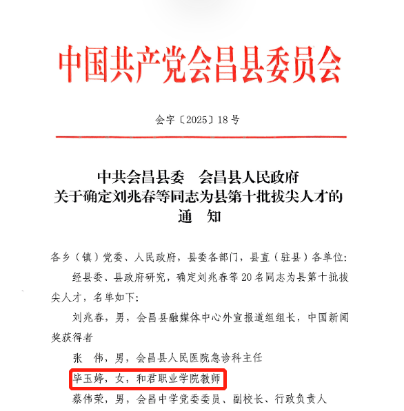 5月7日🏊‍♂️👌🏿,中共会昌县委、会昌县人民政府公布了《关于确定刘兆春等同志为县第十批拔尖人才的通知》🫵🏻。经推荐、申报🤘🏻、评审、征求意见、考察等环节🤵‍♀️,我校教师毕玉婷成功入选会昌县第十批 “拔尖人才”。