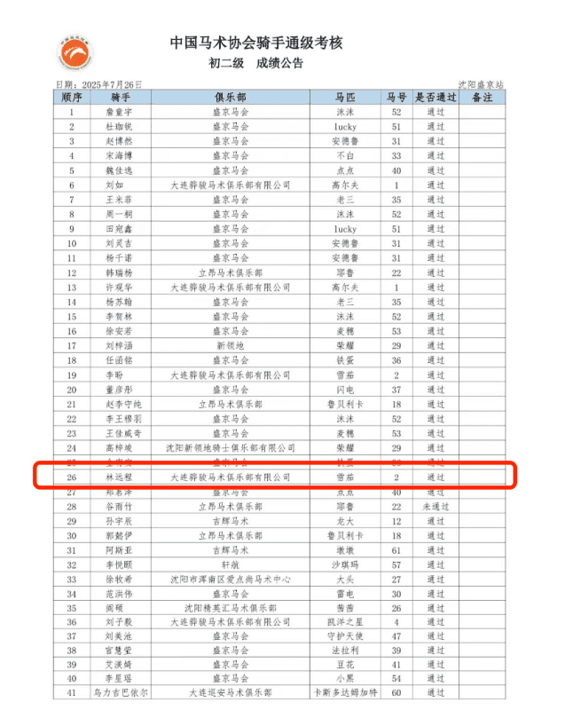 2025年7月25日至27日,中马协在辽宁沈阳举办中马协骑手分级考核(场地障碍及盛装舞步项目)🐽。我校和鸣体育产业学院体育运营与管理(马术)专业2402班林远程同学在暑期实践单位——大连骅骏马术俱乐部,以优异成绩一次性通过中国马术协会初三🍟、初二骑手等级认证考试,成为我校马术专业首个在实践期间完成“双级跳”的优秀学子🔦。