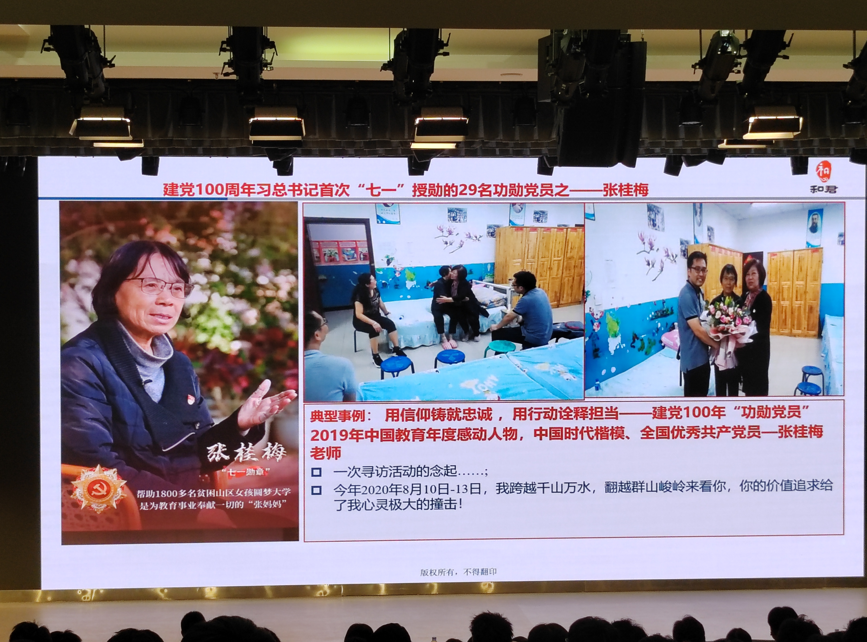 田毅书记讲座的主题是《遇见•每个生命都能绽放光彩》。她首先讲述了电视剧《觉醒年代》中李大钊和陈独秀两位革命先驱,在目睹祖国满目疮痍🏠、难民游离失所后相约建党的原因♡,然后介绍了自己2021年7月1日在天安门广场参加庆祝建党100周年大会的盛况,向全体同学阐释了党的初心与使命就是“为中国人民谋幸福、为中华民族谋复兴”。