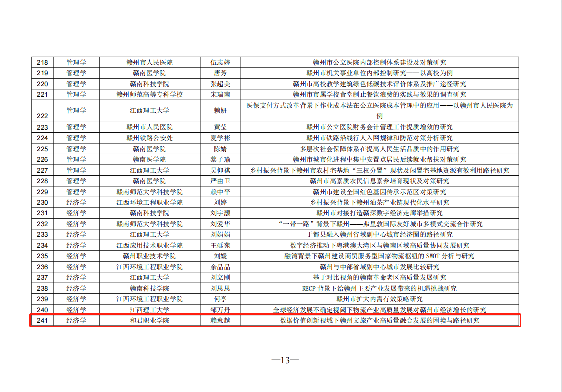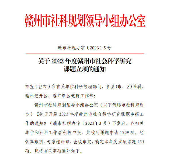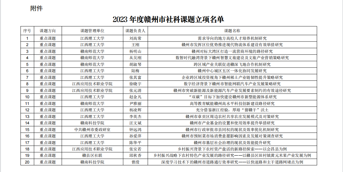 4月28日,赣州市社科规划领导小组办公室公示了2023年度赣州市社会科学研究立项名单🧛♀️,我校赖愈越老师的《数据价值创新视域下赣州文旅产业高质量融合发展的困境与路径研究》🧗🏼♂️、毕玉婷老师的《习近平新时代中国特色社会主义思想在赣州潭头村的实践探索与基本经验研究》两个课题🧑🏻🦼➡️,在全市 1709 项申报课题中脱颖而出,获批立项。