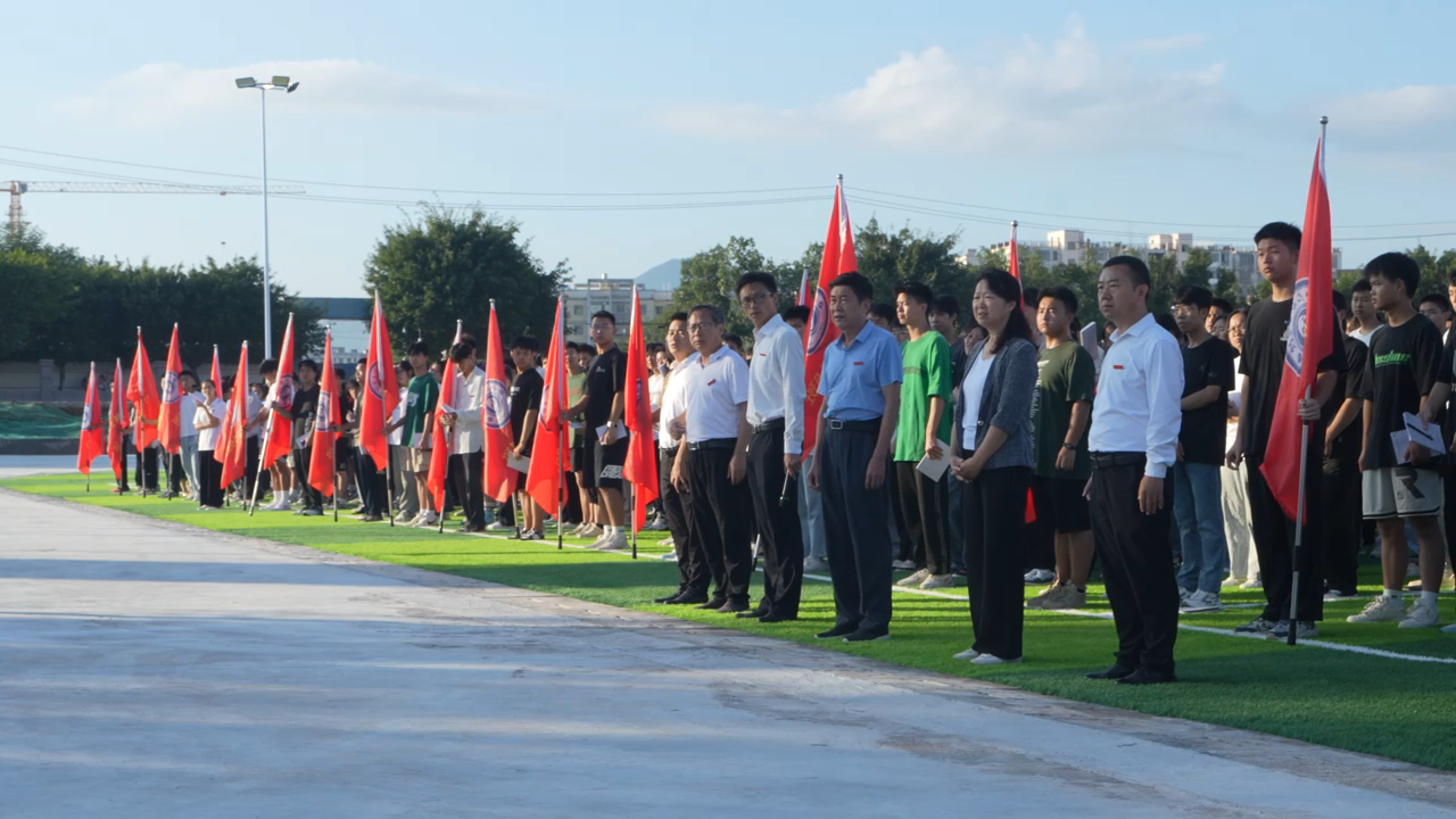 9月18日上午7点👴🏽,伴随着朝阳🏌🏼‍♀️,稀金产业学院第一次升旗仪式正式开始,一面鲜艳的五星红旗伴随着雄壮的国歌冉冉升起🙎🏽‍♀️,参加仪式的学校各级领导、教职工与1500余名学生一起行注目礼,共同高唱国歌!