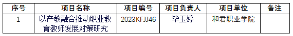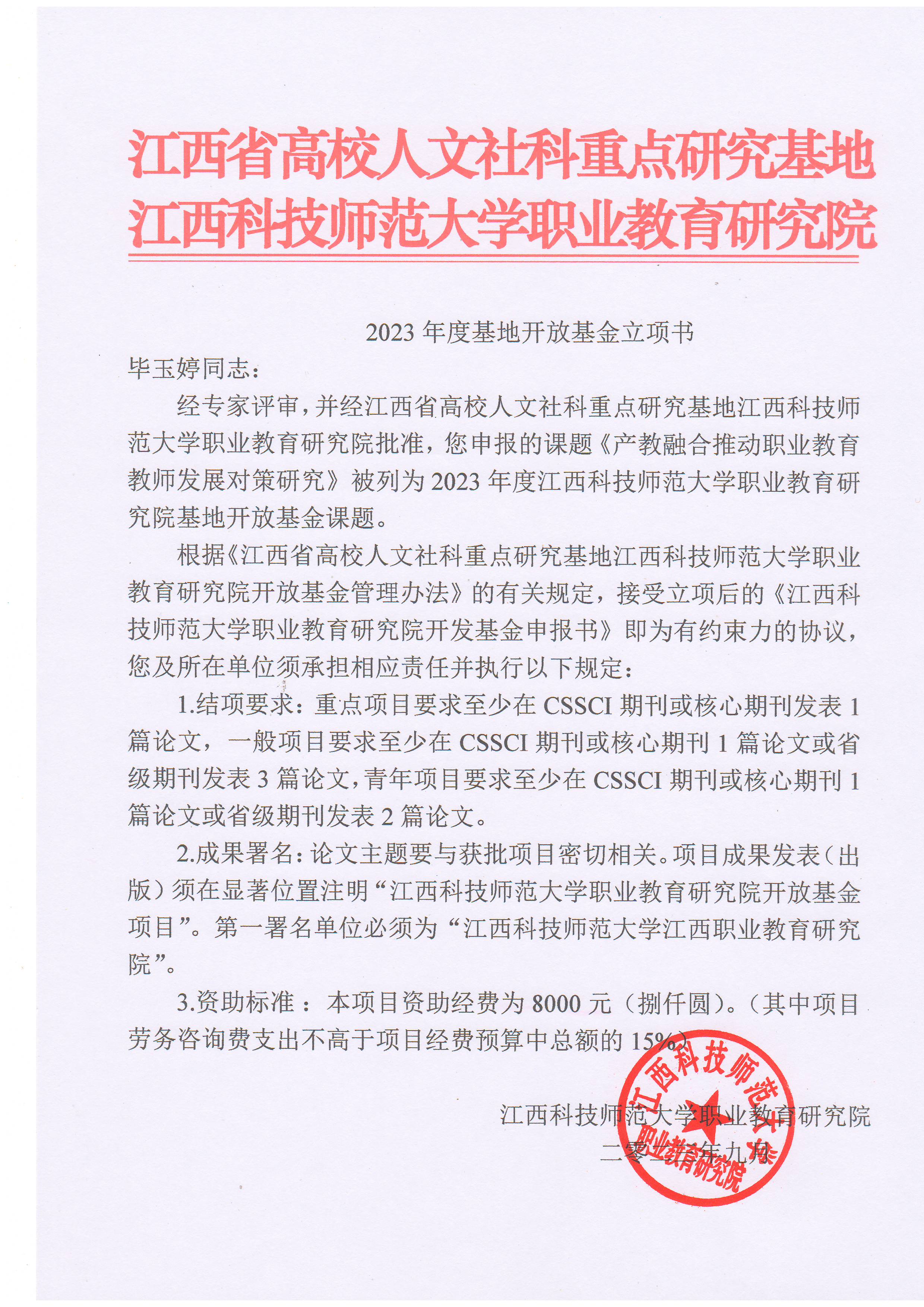 近日,我校教师毕玉婷领衔的研究项目《以产教融合推动职业教育教师发展对策研究》获得江西省高校人文社科重点研究基地——江西科技师范大学职业教育研究院的正式立项。