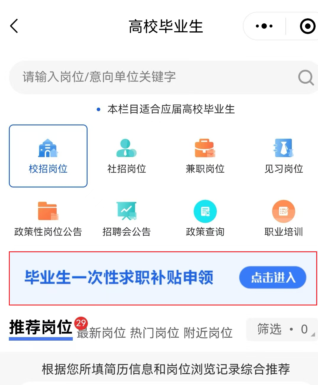 1.搜索微信小程序“江西就业之家”→高校毕业生→毕业生一次性求职补贴申领→点击进入。