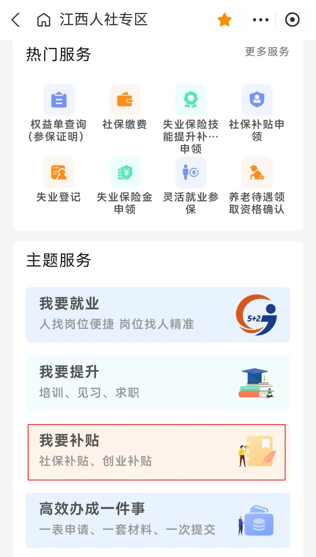 3.关注微信公众号“江西人社”→微服务→我要办事→我要补贴→毕业生一次性求职补贴申领。