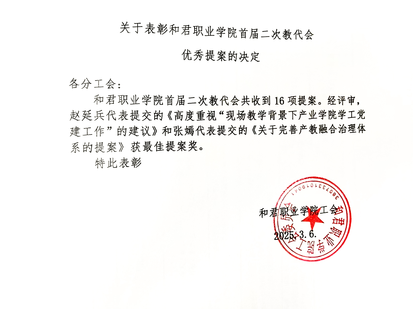 彩神xl首届二次教代会共收到16项提案👱🏽。经评审🤹🏽‍♀️,赵延兵代表提交的《高度重视“现场教学背景下产业学院学工党建工作”的建议》和张嫣代表提交的《关于完善产教融合治理体系的提案》获最佳提案奖。